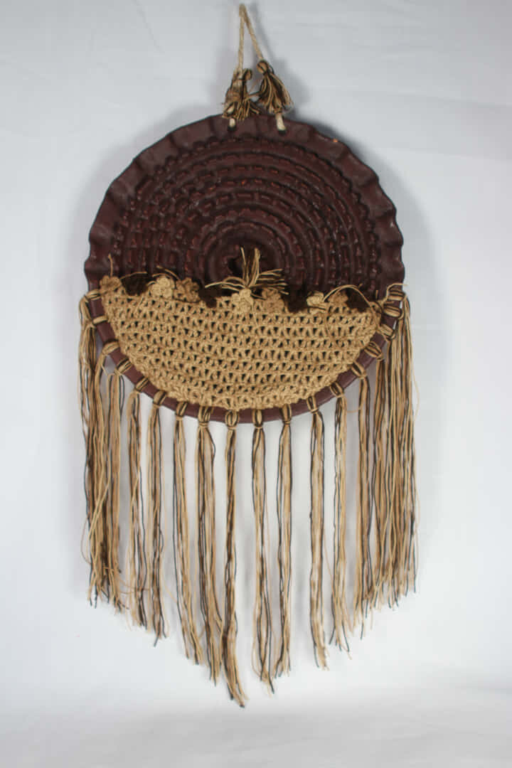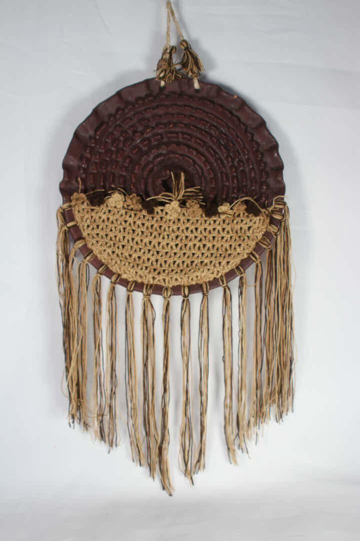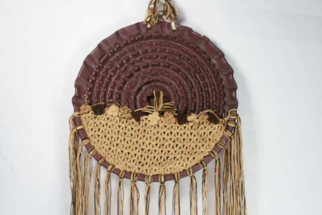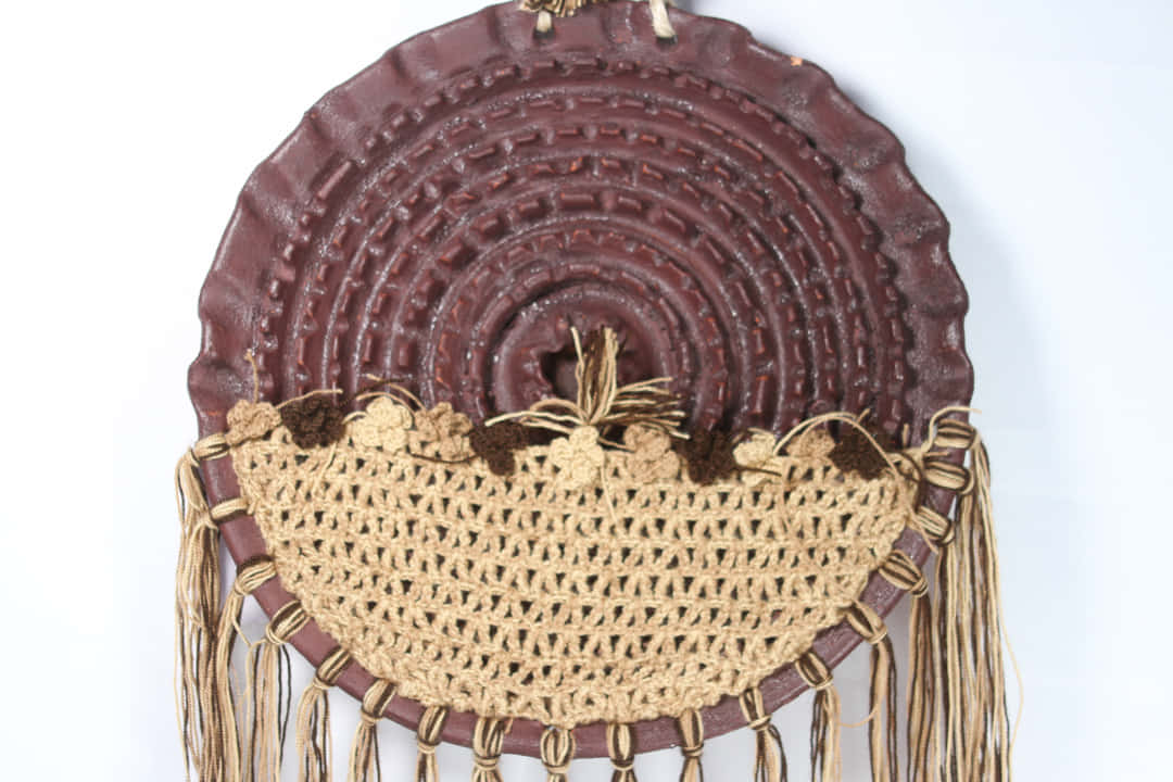 Elaborado en arcilla roja con decoraciones tejidas en hilo pabilo y mecatillo.