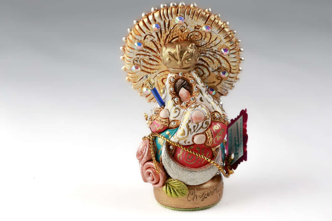 Mini pieza de arte sacro, modelada en cerámica barbotina con apliques de pedrería y pintada en acrílico.
